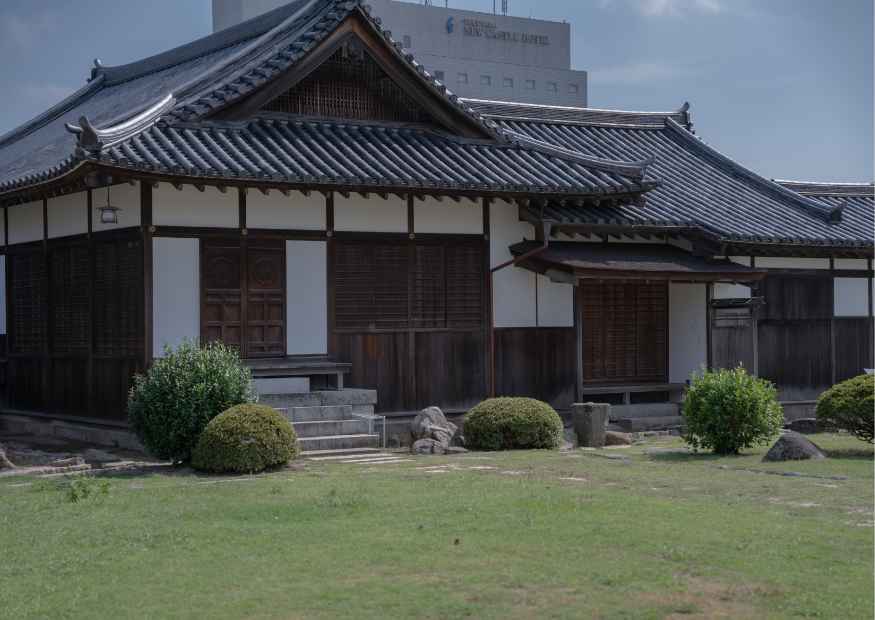 「福寿会館」は、昭和初期に財を成した海産物商・安部和助氏によって建造された格式高い建物です。その建築には、本館、西茶室、南茶室、西蔵、東蔵、洋館が含まれ、いずれも国の登録有形文化財に指定されています。敷地は7,395平方メートルと広大で、福山城北東に位置し、江戸時代には藩の御用米を納める五千石蔵が軒を連ねていた歴史ある地です。福山城キャッスルステイでは、この由緒ある会館でのチェックインや衣装へのお着替えが、旅の始まりとして提供され、歴史と格式が息づく特別な体験が待っています。